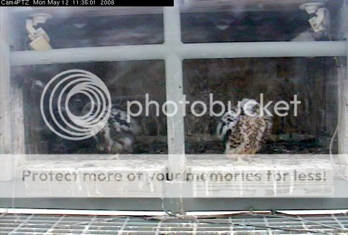 Again a day with a lot of food. Fresh pigeon is being brought in by S2 several times a day. She just loves to feed her chicklets. They are very fast in growing up. The beginning of the flight feathers getting loose from their protective shaft is becoming more eminent. The brown behind the eyses and on the head is becoming more visible every day.